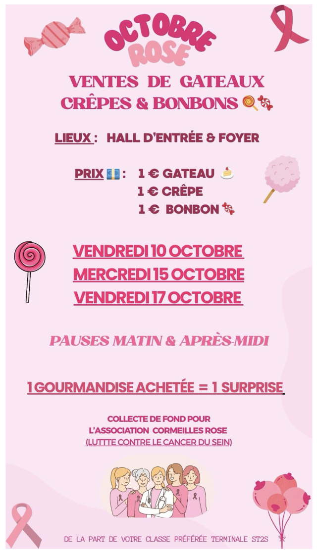 Dans le cadre du mois Octobre Rose, les élèves de la classe de terminale ST2S ont organisé une vente de gâteaux et confiseries sur les temps d’interclasses le vendredi 10, mercredi 15 et vendredi 17 octobre dernier.